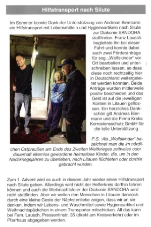 Zum 1. Advent gab es wieder einen Hilfstransport nach Silute / Heydekrug in Litauen. Zur Fahrt und dem aktuellen Stand schreibt der sehr engagierte Hauptverantwortliche der Litauenhilfe Franz Lausch: